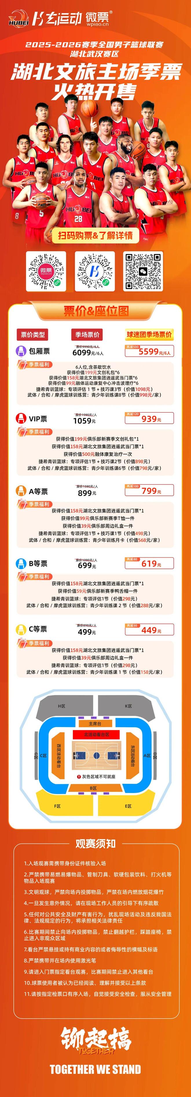 随着新赛季临近,球队季票已正式开售,球迷可通过扫描官方指定二维码直接抢购。早鸟限时福利丰厚,其中VIP季票不仅涵盖全赛季主场赛事观赛权益,还赠送湖北文旅集团“逍遥武当”VR互动体验馆门票、新赛季周边T恤、背心、限量手环、折扇等衍生品。各档季票均仅限100份,稀缺性十足。